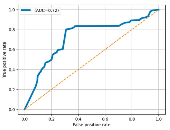 One of the contributions of our paper is the detection of new variants of COVID-19. The question is, how can we evaluate the new variant prediction mechanism? For this, we followed a strategy where we used seven variants for training the classification network and three variants for evaluating new variant prediction, including C.1.2, P.2, and B.1.427. The train and test splits are given in Table 1. The ability of the new variant to predict the proposed technique was assessed using the ROC curve and AUC values. The ROC curve calculates the contrast between the true positive rate (TPR) and the false positive rate (FPR) at different threshold values for classification decisions. In this problem, the TPR reflects the new variant samples detected as new variants, while the FPR reflects the old variant samples detected as new variants. Figure 8 shows that the proposed technique achieved a 0.72 AUC value. The current achieved accuracy is very reasonable to begin a detailed analysis of such sequences from genomic experts for the early treatment of new variants.