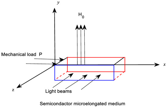 In this section, the Materials and Methods are described in sufficient detail. When a uniform magnetic field in the direction of -axial is applied to a microelongated stimulated semiconductor medium. The induced magnetic field is created in this instance in the same direction. However, the induced electric field is generated in the vertical direction, resulting in the current density (see Figure 1). According to a microelongated semiconductor medium that is flowing slowly and has a particle velocity of . In 2D, is the displacement vector, and are the components of the displacement vector and the strain takes the form (cubical dilatation). Since the electric permeability is and the magnetic constant permeability is , the linearized electromagnetic Maxwell’s equations are written as follows: