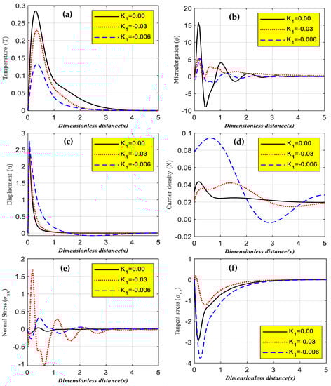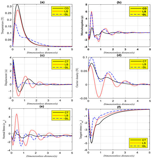 Figure 2 overall perspective shows that every physical quantity being studied satisfies the surface requirements of the microelongated semiconductor. The thermal wave (Figure 2a) and carrier density distribution start at zero and positive values, respectively, and increase in amplitude to reach their maximum values under the pressure force of the electromagnetic field and the thermal impact of light. The temperature distribution drops exponentially with wave behavior until it converges with the zero line as the distance grows, at which point it reaches its lowest value. However, the plasma wave (Figure 2d) in the second band exhibits a wave behavior, decreasing and increasing until it converges to the zero line. The two subfigures show that the thermal wave and plasma wave behaviors match those of the experiments reported in [51]. The microelongation wave propagation (Figure 2b), which starts at the surface from zero and declines in the closed initial range due to the magnetic pressure force and grows then decreases regularly with the wave behavior, can be used to characterize the microelongation scalar function. Due to the weak magnetic field far from the semiconductor surface, the microelongation wave eventually converges to the zero line and establishes equilibrium inside the medium. The elastic wave (Figure 2c), which has a displacement component that can be defined, begins on the surface and rapidly rises as a result of an increase in particle vibrations caused by the magnetic field’s pressure force and thermal stimulation to reach its maximum value. However, in the second range, the elastic wave alternates between periodic drops and increases as wave behavior spreads with the convergence of the zero line, eventually reaching the equilibrium state. The distribution of mechanical waves (Figure 2e) are represented by the tangent stress component and normal stress component . The normal distributions decline in the first range, increase in the second range, and then regularly decrease and grow with wave behavior until they reach the equilibrium state. The tangent distribution , (Figure 2f) on the other hand, starts at zero and decreases close to the surface until it approaches the minimal value. In the second range, as the distance increases, the tangent distribution gradually grows until it hits the zero line (state of equilibrium). The wave propagations of the physical fields are impacted by the various relaxation time values. All of the subforms exhibit the same behavior for wave propagation processes with varied photothermal elasticity model values, but the extent of the differences depends on the values of the various relaxation times.