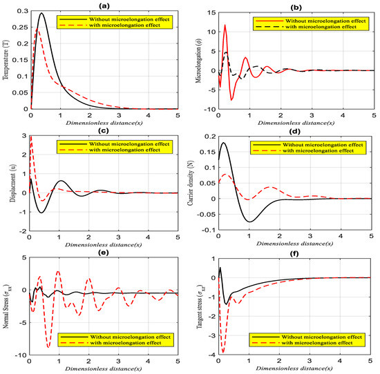 Figure 3a−f compare the primary physical fields in two separate situations when a magnetic field was present at the same time for relatively brief periods. When the silicon material’s microelongation properties are disregarded, the first scenario is obtained. However, when the microelongation characteristics of the microelongated silicon material are taken into consideration, the second scenario is explored. According to the GL model, all calculations are carried out within the framework of the magneto-photo-thermoelasticity theory. This figure shows how the microelongation settings affect wave propagations and their magnitudes.