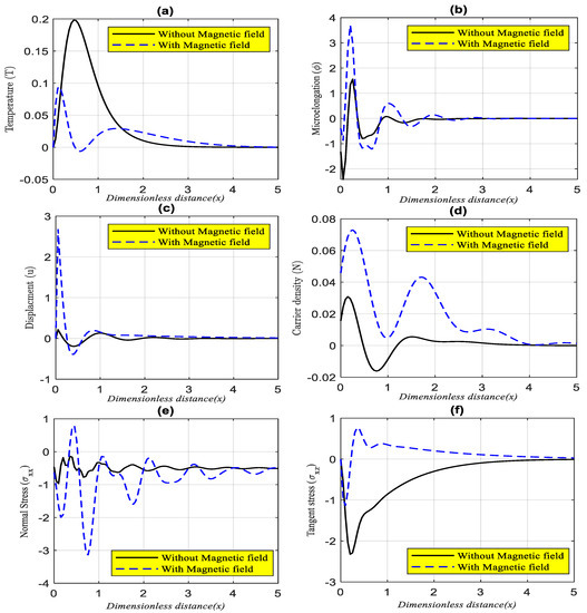 ((a) temperature distribution, (b) microelongation distribution, (c) displacement distribution, (d) carrier density distribution, (e) normal stress distribution, and (f) tangent stress distribution) The wave propagations of main physical fields with horizontal non-dimensional axis according to the GL model and a magnetic field both with and without microelongation parameters.