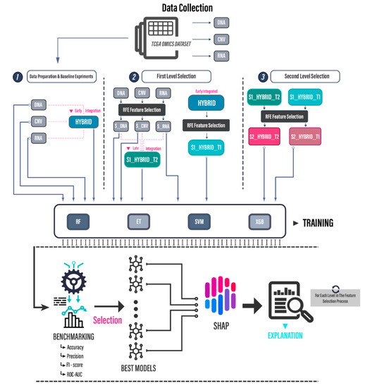 Considering this, we intend to develop a model that can accurately predict five cancer subtypes while also remaining highly interpretable for future research. The study utilizes three distinct data types, DNA methylation, CNV, and mRNA descriptors (for short, we will refer to them as DNA, CNV, and RNA, respectively, in the rest of the paper), as well as a two-stage feature selection approach with multiple data integration strategies. The process begins by establishing a benchmark against which we monitor the prediction progress. This is achieved by integrating the data from the three sources into one dataset named as HYBRID in Figure 1. After feeding the data to the machine learning fine-tuned models, the results are computed using a cross-validation procedure. In the multi-step feature selection process that follows, feature selection is applied, new datasets are generated, and benchmark reports are compiled. At each stage, each set of features is individually and collectively analyzed based on SHAP interpretation to determine the significance of each feature, the impact of their fusion, and how their fusion technique affects the classification task.