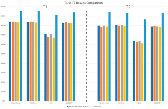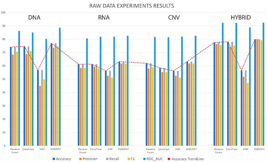 The experimental results will be presented according to the workflow depicted in Figure 1. First, we will describe the experiments that were carried out using the baseline datasets and the hybrid datasets obtained during the early integration. The first-level feature selection experiments’ results will then be discussed and different integration schemes will be evaluated. After that, the results of the second level feature selection experiments will be presented and discussed with further interpretation. The obtained results will be compared to those of other techniques described in the literature. The impact of the features on classification will also be discussed.