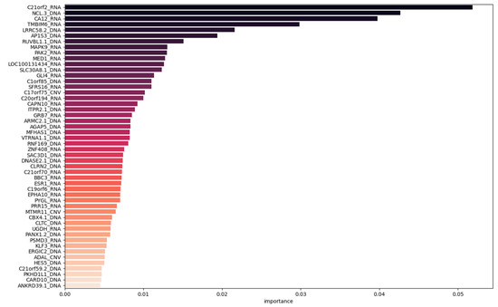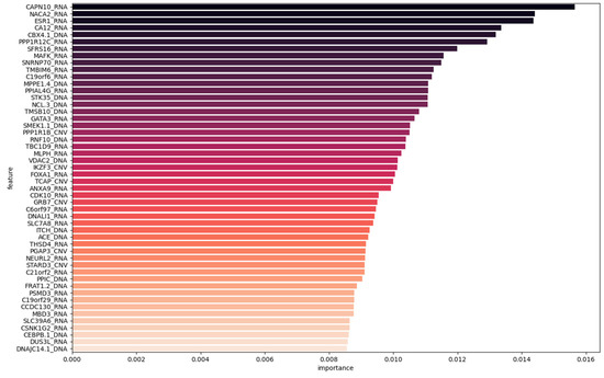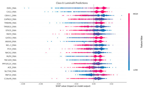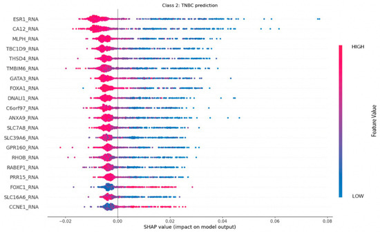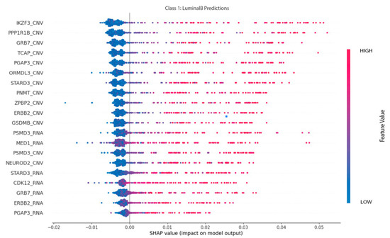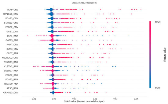 As shown in Figure 14, the main features regarding ERBB2 predictions are RNA and CNV features. TCAP, PPP1R1B, and PGAP are CNV features that positively influence this class prediction. RNA features, such as ESR1, GATA3, and CLSTN2, have a negative impact on this classification, however.