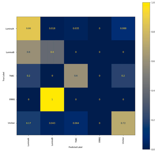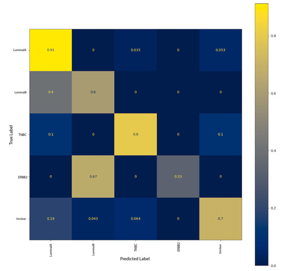 As mentioned earlier, the target feature has five levels: luminal A, luminal B, ERBB2(HER2(+)), TNBC, and Unclear. Therefore, the confusion matrix corresponding to the multiclass classification is a 5 × 5 matrix. Based on the one-versus-rest strategy, true positive (TP), true negative (TN), false positive (FP), and false negative (FN) are defined. The following performance metrics are used to assess the performance of the various proposed models using the selected features and integration schemes. These measures are derived from the confusion matrix as follows: