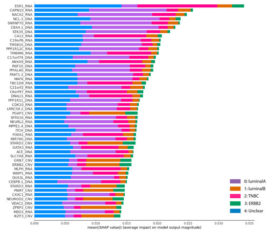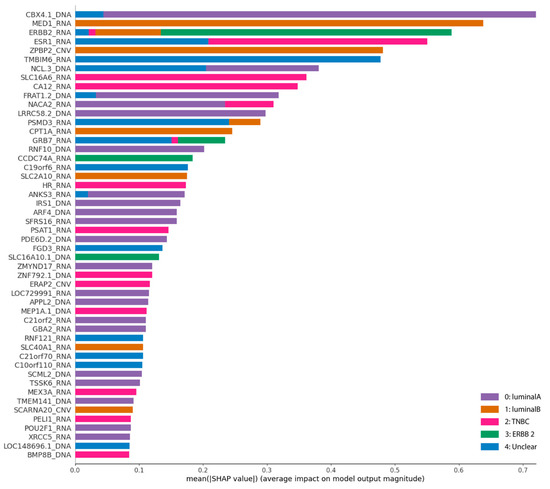 feature selection; multi-class classification; explainable AI; breast cancer sub-typing; multi-omics data; SHAP plots MSC: