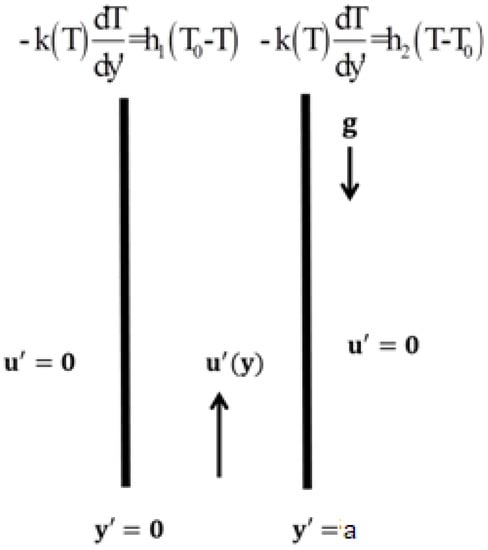 Including the nonlinear buoyancy approximation, nonlinear internal heat, and exponential dependence of fluid viscosity and thermal conductivity is expected to produce a better approximation of reactive flow and heat transfer problems, especially during a number of engineering processes, such as advanced powder synthesis by self-propagating high-temperature, heat exchangers, loop/fluidized bed reactors, treatment of reactive hydrocarbons, combustion chambers and many more engineering applications. In the next section, the mathematical analysis of the problem is presented.
