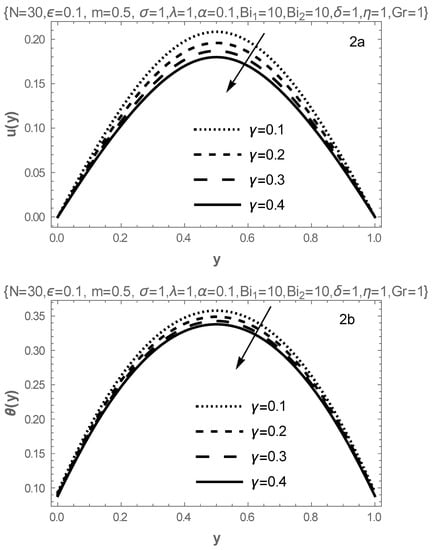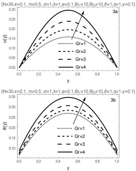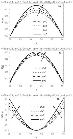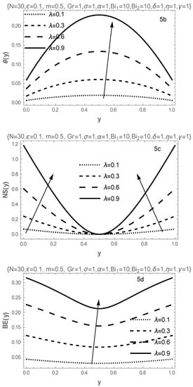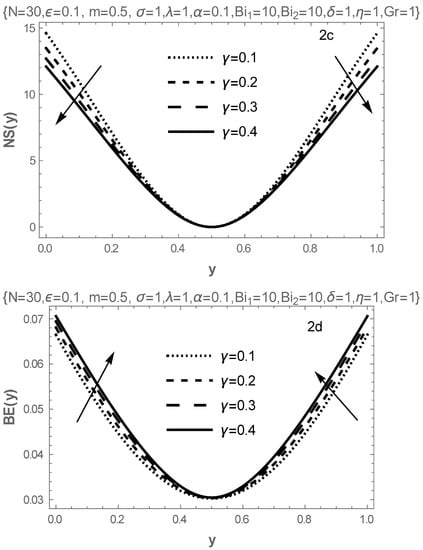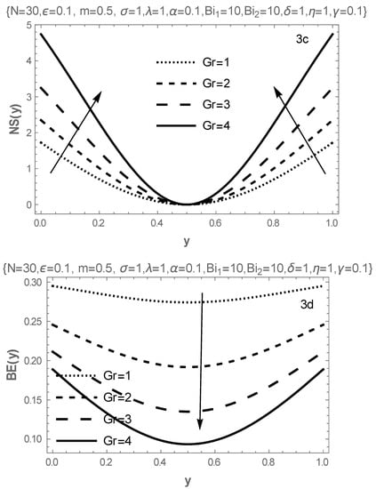 Figure 3a–d represent the impact of buoyancy forces on the flow field on the velocity, temperature, entropy generation rate, and the Bejan number respectively. From Figure 3a, the velocity profile shows that when Gr = 1 implies a simple case when viscous force and buoyancy force are equal. Further increase in the Grashof number implies that the contribution of viscous force is weaker when compared with buoyancy, therefore, the flow velocity increases significantly in response to the nonlinear buoyancy forces. A similar behavior is seen in the profile for fluid temperature (see Figure 3b) resulting from increase in the kinetic energy of the fluid. Consequently in Figure 3c, the entropy profile is expected to increase due to increase in both flow and temperature maximum. In Figure 3d, rise in Grashof number implies increasing temperature as seen in Figure 3b. Therefore, increasing temperature translates to a decreased rate of heat transfer, this shows that irreversibility due to frictional interactions is more when compared with heat transfer irreversibility as revealed in Figure 3d. The graphical representations of the effect of the nonlinear convection component of the Grashof number on the flow velocity, temperature, entropy generation, and Bejan number respectively depicted in Figure 4a–d. The point when corresponds to the linearized buoyancy parameter when the nonlinear effect is neglected. As shown in the Figure 4a, this parameter has a significant effect on the fluid flow and cannot be neglected. Also, in Figure 4b, an increased value of the parameter is also seen to elevate the fluid temperature maximum. Similar effect is noticed in Figure 4c, the rate of entropy generation improves at both convective walls while in Figure 4d, the frictional irreversibility decreases within the flow channel, due to a decrease in heat transfer.
