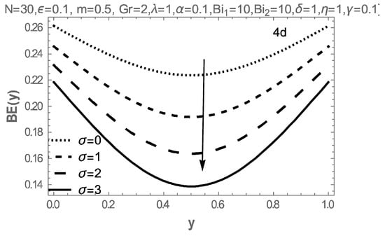 The influence of the reaction kinetics coefficient () on the flow and thermal structure is presented in Figure 5a. It is evidently shown that the velocity distribution enhanced for larger . This is due to the thinning effect on the fluid viscosity and the heat transfer from the strongly exothermic reaction to the fluid. In Figure 5b, similar behavior is experienced with the fluid temperature, except at the cooled walls with increasing flow and temperature. As expected the entropy generation rate is to rise for increased values of as shown in Figure 5c, while larger significantly increase the Bejan profile. This in turn encourages heat transfer irreversibility over fluid friction irreversibility as seen in Figure 5d.