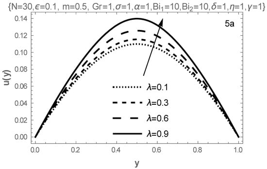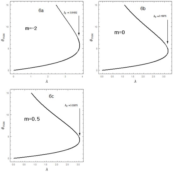 Finally, Figure 6a–c shows the bifurcation plots for different reaction kinetics (m = −2, 0, 0.5). As observed from these plots, the blow-up point increases with increasing values of the exponent, thus thermal stability is enhanced.