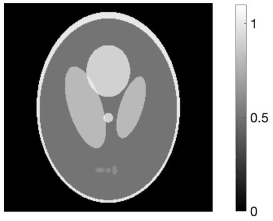 We used a modified Shepp–Logan phantom image composed of and pixels ( 65,536), as shown in Figure 1, and a projection created by specifying the number of projections and detectors to 360 and 365, respectively ( 131,400), with 180-degree sampling. The calculation of the forward projection is performed using a highly optimized library for matrix-vector multiplication in MATLAB.