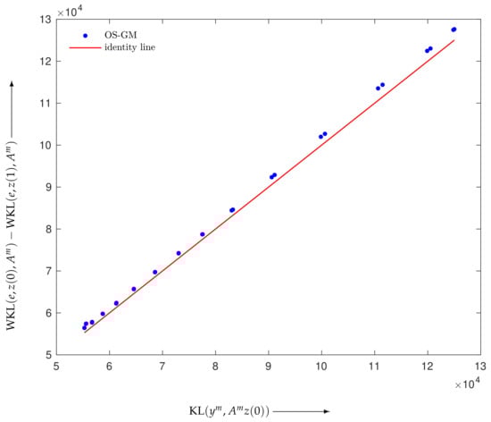 We performed a reconstruction using the weighted geometric mean defined in Equation (8) with , , , and a noise-free projection . An example indicating the validity of Equation (15) is shown in Figure 2, which plots versus applying a one-step iteration computed from a given initial state through random elements for . It can be seen that all the points lie above the line of equality (identity line), as stated in Theorem 1. Another experiment with different values of yielded similar results.