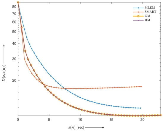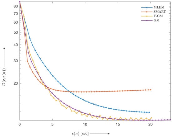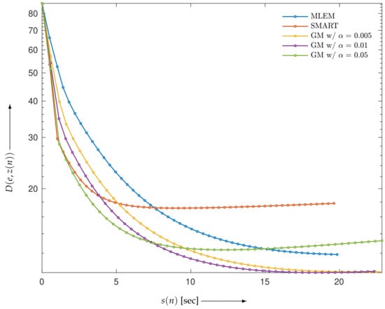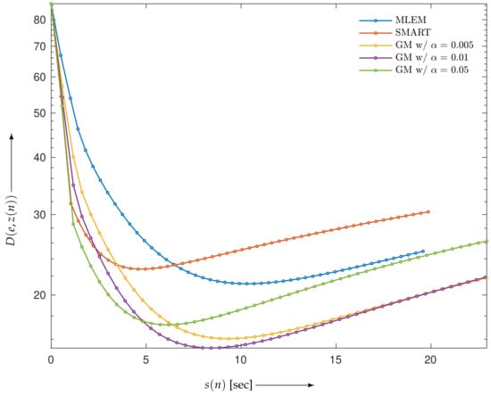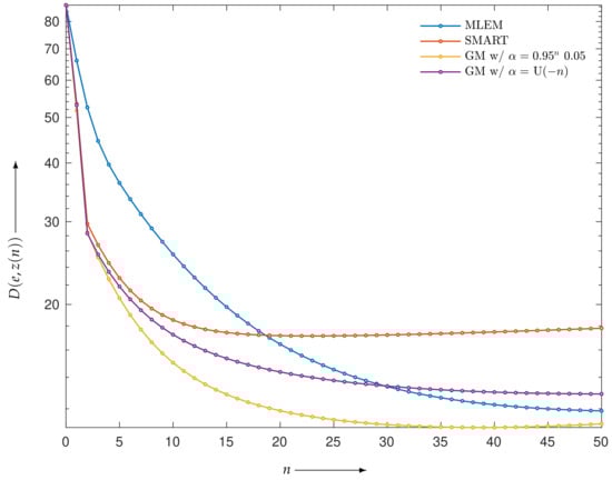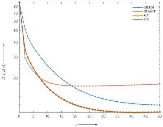 for evaluating compared with where denotes a projection operator with K rows. The reason why the KL-divergence is used for evaluating the convergence is that it can be considered as an objective function of which there exists a minimizer for each of MLEM and SMART [27,32,33,34].