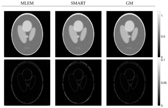 Figure 4 graphs the evaluation functions versus the real computation time (in seconds) as a function of the iteration number n for under the same settings as in Figure 3. At each iteration of the one-step algorithm, the coefficient in Equation (28) was pre-calculated for all algorithms, and the ratio between the measured and forward projections defined in Equation (29) for each of GM and HM was calculated at every . The reconstruction time of the proposed algorithm is approximately 22 s, whereas MLEM and SMART take approximately 20 s in total. Although the proposed algorithm takes 10% longer than the conventional ones, it provides a smaller evaluation function for almost the same computation time ( for GM or HM) as MLEM or SMART at the 50th iteration. Figure 5 shows images reconstructed by MLEM, SMART, and GM, and the corresponding subtraction images at every pixel, defined as in Equation (30) with , , and . The density value of d is on a common scale. By comparing, e.g., the edges of the high-density outer rims in the images, it can be seen that GM generates high-quality reconstructions; this is quantitatively confirmed by the small evaluation function between the phantom and reconstructed images.