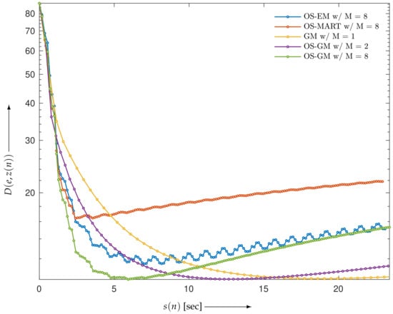 Notice that each of the iterative Equations (8) and (10) as combinations of weighted geometric and hybrid means reduces to an OS-EM algorithm when and and to the OS-MART algorithm when and . A larger value of h in Equations (8) and (10) can accelerate convergence, but the algorithm diverges or oscillates when it is too large. The value of h in our theoretical and experimental results was chosen to be 1 according to the experimental results of OS-EM and OS-MART algorithms as multiplicative Euler discretizations of their continuous analogs [27,34].