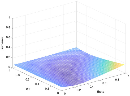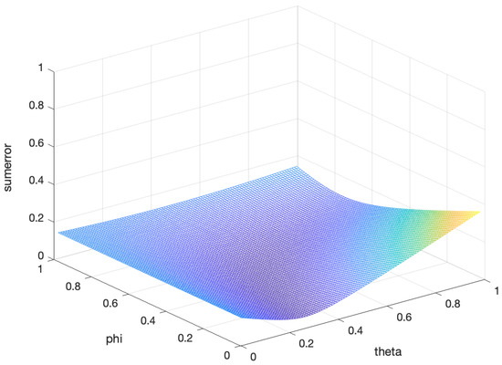 In the five-fold cross-validation, we obtained the error between the proposed estimation and the population covariance matrix for the different parameters and under three asset dimensions. In Figure 1, Figure 2 and Figure 3, the horizontal and longitudinal axis represent the different values of and , respectively, and the vertical axis represents the sum of the error. It is obvious that there are two optimal parameters to minimizing the error between the proposed estimator and the population covariance matrix for all and . The results are shown in Table 3. To some degree, this ensures the effectiveness of the proposed estimation.