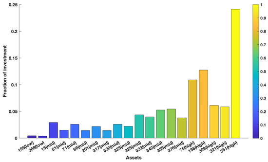 Table 4 shows that the F-norm error of our new estimation is the smallest in the ones of the six estimations. Under this premise, we calculated the portfolio variance in the minimum variance portfolio that satisfies the minimum 0.0015 expected return. The results are shown in Table 5. Figure 4, Figure 5 and Figure 6 show the mean return of out-of-sample data ranging from the 1st asset to the 400th asset. We mark individual points on the graph. The horizontal and longitudinal axis represent the order of assets in the total assets and the mean return of this asset, respectively. We can see that the mean return of the point that is marked is relatively high. Generally speaking, higher asset returns will also face relatively large investment risks. To understand the following description, we divided the return into three asset risk grades: high (), middle (), and low (), respectively. In Table 5, it is obvious that the variance of is the largest in all asset dimensions. In the case of , the asset weights of the portfolio model corresponding to are distributed on the 15th, 51st, 71st, 75th, and 138th assets in Figure 7, respectively, with high-risk assets and medium assets. However, in the case of , the asset weights of the portfolio model corresponding to are distributed on twenty assets, with high-risk assets, medium assets, and only low-risk assets, and we can see that the high-risk and medium-risk assets account for the vast majority of the 20 assets. Instead, the portfolio model corresponding to our new estimator distributed the weights on high-risk assets and medium-risk assets as and , respectively, to achieve the expected return. The remaining was distributed on low-risk assets to reduce investment risk. The corresponding results are shown in Figure 8 and Figure 9. Overall, the reasonable distribution of asset weights on high-, medium, and low-risk assets can appropriately decrease investment risks. As the number of the assets increased, the performance of our new estimator became better. At the same time, the proposed estimation in the minimum variance portfolio was more dispersed on the allocation of the assets.