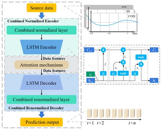 The CNC model comprises three parts: combined normalization encoder, attention mechanism [26], and combined renormalization decoder. The combined normalization encoder integrates an adaptive combined normalization layer containing three normalization calculation methods: z-score [27], Interval [25], and Max [28] normalization. During the model training process, the unprocessed pollutant indicator data are directly input into the adaptive combined normalization layer in batches. Three normalized calculations are obtained by separately obtaining the batch data’s mean, variance, and other statistics. In order to synthesize the advantages of the three calculation methods and get the optimal processing effect, the results of the three normalization calculations are weighted and selected based on the Softmax function [29]. The weights are obtained from the model training to finally generate the weighted normalized processing results. These results are scaled and panned by the learnable parameters α and β that can be dynamically adjusted according to the current model training effect. The exponential weighted average method is used to fit the global distribution of the data, and the iterative estimation is performed according to the statistics of each batch of data. The optimal global statistics are retained, and the prediction accuracy of the data by the final training model is improved. The normalized data are encoded by a multilayer LSTM [30].