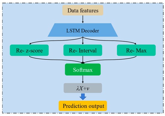 The combined renormalization decoder consists of an LSTM model and an adaptive combined renormalization layer. Figure 4 shows the schematic structure of the combined renormalization decoder layer. The output features of the attention mechanism first go through a decoder consisting of multiple layers of LSTMs, which decode the features into normalized predicted values. In order to get the actual predicted value, this value needs to be processed using a combined renormalization layer. Corresponding to the normalization calculation, the adaptive merging and renormalization layer includes three renormalization calculations, which are calculated as follows: