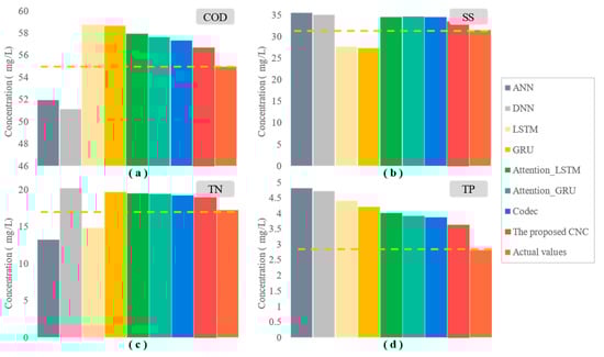 Based on the data of pollutant concentration indicators in the actual brewery wastewater treatment process, the prediction accuracy of the proposed model and seven classical prediction models, including ANN [41], deep neural network (DNN) [42], LSTM [43], gated recurrent unit (GRU) [44], Attention_LSTM [45], Attention_GRU [46], and Codec [47] are compared.