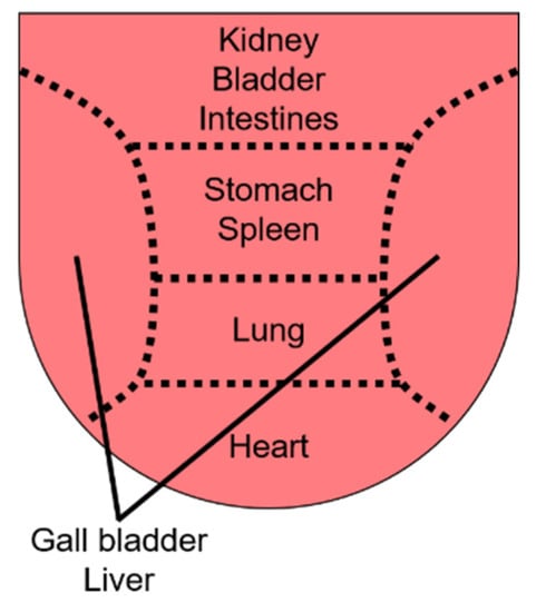 Tongue diagnosis is a very traditional and effective method which has been widely used for disease diagnosis in Traditional Chinese medicine (TCM) since more than 2000 years ago [1,2]. In TCM, it is believed that different regions of the tongue reflect the fitness of five corresponding organ systems: liver, lung, spleen, heart and kidney [1]. If a disease occurs in one of the organs of the body, an abnormality will occur in the corresponding area of the tongue, as shown in Figure 1 [3]. Since the tongue reflects the fitness of the body’s corresponding organ system, it can help us to determine the body’s energy pattern, the pain that one is experiencing, or the underlying cause of the disease.