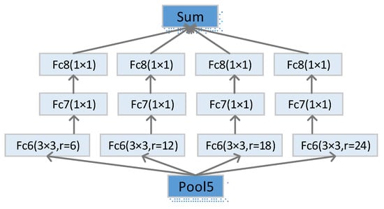 Recently, it has been proven that we can get a better performance by using pyramid representations for multi-scale images. Spatial pyramid pooling (SPP) was first introduced in CNNs by He et al. [42]. The network structure using SPP is capable of producing a fixed-size representation without considering the size or scale of the input image. It is robust to the change of the object shape. DeepLabV2 [43] replaces the traditional CNNs with parallel atrous convolutional layers and proposes a scheme called atrous spatial pyramid pooling (ASPP), which uses different sampling rates for parallel branches as shown in Figure 3. This is equivalent to processing original images with scale-different filters that have multiple effective fields of view, which can capture image context at multiple scales.