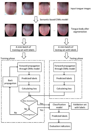 Now, the detailed procedures of the training tongue color feature extraction model is shown in Figure 6. First, the tongue body of the images is acquired by the well-trained semantic-based CNNs model as described in Section 3.3.1. Then, the dataset is divided into the training set and testing set using ten-fold cross-validation. In the training phase, a mini batch of the training set is used as the input of CNNs during forward propagation. After that, the loss value of softmax and center loss are calculated using the output of forward propagation and the ground truth. We update the parameters of CNNs using back propagation and standard SGD.