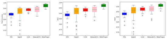 To quantitatively observe the effectiveness of the proposed model, we select three metrics, including pixel accuracy (PA), mean intersection over union (mIoU) and Dice coefficient (Dice) for the performance measurement. The experimental results are provided in Table 1 and Figure 7. The experimental results show that the proposed method provides a better result compared to the baseline methods. For example, as shown in Table 1, in terms of PA, the SegTongue achieves gains of 8.6% compared to FCN, 4.0% compared to U-Net, 6.7% compared to SegNet and 3.2% compared to DeepLabV3+, respectively. Furthermore, SegTongue is also superior to other baseline models based on the other two metrics. In addition, as can be seen from Figure 7, the SegTongue exhibits higher stability compared to Segnet and U-net. A possible reason for this fact is that the predictions by those baseline methods are not able to extract the boundary and the multi-scale features of the tongue well. Thus, these models have outliers when dealing with boundaries. On the contrary, the SegTongue model can effectively deal with multi-scale and detailed features.