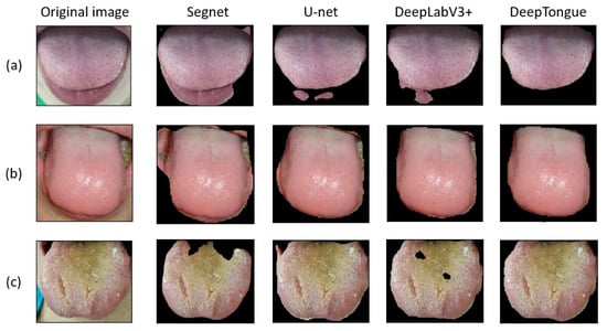 In order to observe the improvement of the proposed model more intuitively, we conduct a qualitative analysis of the experimental results. We selected several pictures containing lips, teeth and tongue fur with abnormal colors as experimental data. Segnet, U-net, DeepLabV3+ are used as the baseline for comparison. Some examples of experimental results are shown in Figure 8. In Figure 8a,b, we can see that the segmentation of the tongue is severely affected by the lips and teeth, especially the lips, whose color is very close to the tongue. From the experimental results, the segmentation of the Segnet network as the benchmark is the worst. The U-net and DeepLabV3+ are slightly better, although they are still not good. Our proposed SegTongue model avoids the interference of lips and teeth and achieves a better tongue segmentation. In Figure 8c, the tongue is covered with a layer of green tongue fur, resulting in an abnormal color. The experimental results show that Segnet and DeepLabV3+ produce holes or incomplete images during processing. The reason may be that the abnormal tongue coating is identified as the background mistakenly. In contrast, our SegTongue segments the tongue well without being disturbed by abnormal tongue coating. In order to observe the effect of our model on multi-scale images, we chose to perform experiments on tongue images at different scales. The results show that although the tongues vary in size, our proposed model divides them well. All these improvements prove the effectiveness of detail and multi-scale feature extraction in SegTongue. It achieves higher accuracy and stability than the baseline.