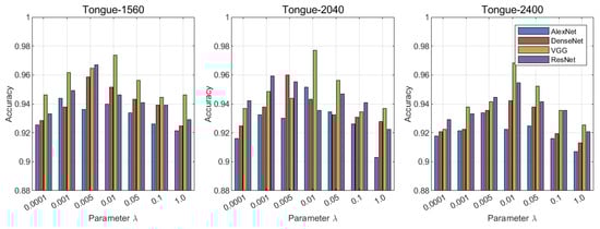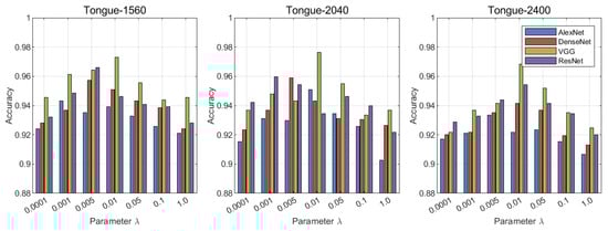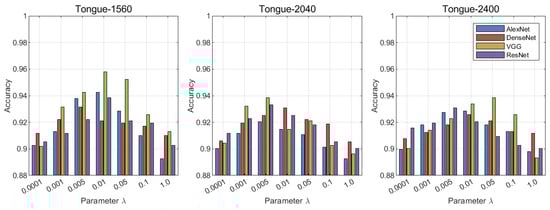 From the curves in Figure 9, Figure 10 and Figure 11, we can see that Vgg-16 obtains the best average overall accuracy in these three datasets under different values. This indicates that Vgg-16 can extract high-level tongue color features efficiently. The ResNet’s overall performance ranks second, and it achieves the second highest accuracy on Tongue-2040 and Tongue-2400 datasets. The results of DenseNet and AlexNet are similar, and their overall performance are worse than the ResNet and Vgg-16.
