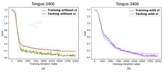In order to observe the effect of the center loss function in the training process, we visualized the change of loss in the training process in Figure 12. Figure 12a shows the changes of loss value when the center loss is not used, and the Figure 12b shows the training process with center loss. As can be seen from the figure, when the center loss is not used, the loss on the validation set is much larger than that on the training set. When using center loss, the loss on the validation set and training set is almost the same. Kawaguchi [49] points out that the generalization gap can be approximately regarded as the difference between the loss on the training set and the loss on the validation set. The smaller the difference is, the stronger the generalization ability of the model has. Therefore, the result is strong evidence that the CNNs models with center loss can learn the common features of different classes and have a strong generalization ability, and if it is used to make predictions for unknown samples, it can achieve more reliable results. In addition, the training process without center loss occurs overfitting, as the loss of a training set is smaller than that of a validation set in the whole process, which means the learned model cannot predict an unknown sample well.