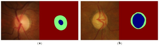Glaucoma is a chronic eye disease that causes irreversible damage to vision. Patients with glaucoma suffer damage to the optic nerve due to increased intraocular pressure (IOP) caused by an imbalance between fluid production and drainage in the eye. The vertical cup-to-disk ratio () is one of the commonly used indicators for clinical screening of glaucoma. Usually, a greater than 0.65 [1] is diagnosed as glaucoma. Figure 1 is a sample map of normal eyes and glaucoma fundus and the corresponding annotation map of the OD and OC. Accurate segmentation of the OD and the OC is essential for accurate acquisition. At present, the clinical diagnosis of glaucoma is mainly made by ophthalmologists through manual diagnosis, which is somewhat subjective—results vary greatly between doctors and are inefficient. With the rapid development of information technology, rapid advances in medically assisted diagnostic techniques have been made, making large-scale glaucoma screening possible.