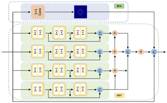 The specific structure of the MBF in the blue dashed box in modules A and B in Figure 2 is shown in Figure 3, including four multiscale feature-extraction branches and one boundary feature auxiliary branch. Each multiscale feature-extraction branch consists of three asymmetric convolutions [17], and each AC consists of an n × 1 and 1 × n convolution. Here, we decompose the 3 × 3 convolution into a 3 × 1 convolution and a 1 × 3 convolution. Compared with a 3 × 3 convolution operation, using AC saves about 33% of the number of parameters for the same number of convolution kernels. The theoretical analysis is shown in Equation (2). The fusion of multiscale features is performed by setting different expansion coefficients. The size of the convolution kernels of the four multiscale feature-extraction branches is 3 × 3, and the size of the receptive field of the convolution kernels with different expansion coefficients is shown in Equation (3). For the MBF module in the spatial-detail information-extraction module, the expansion coefficients of the four branches are [1, 1, 2, 3] in sequence. For the MBF module in the context-information-extraction module, the expansion coefficients of the four branches are [1, 2, 3, 5] in sequence. At the same time, to reduce the feature loss in the convolution process, for each multiscale branch, the output feature maps of the three AC operations are concatenated as the output feature map of the branch.