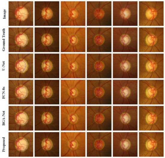 , , and represent the number of true positives, false positives, and false negatives, respectively, and represent the vertical cup-to-disc ratio of the OD and OC of the predicted segmentation map and the vertical cup-to-disc ratio of the OD and OC of the annotated map, respectively. This paper uses the average error to evaluate the difference between and , and lower values represent better prediction results.