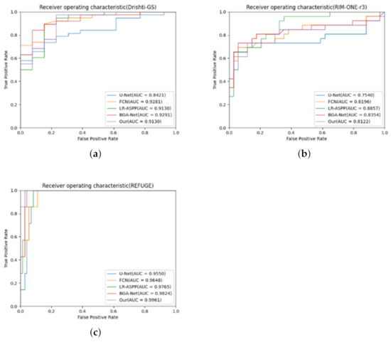 ROC curves for the dataset. (a) is the ROC curve for the Drishti-GS dataset, (b) is the ROC curve for the RIM-ONE-r3 dataset, and (c) is the ROC curve for the REFUGE-train dataset.