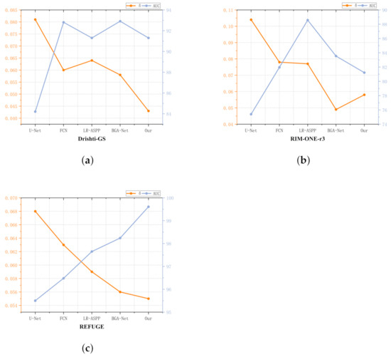 To better analyze the correlation between the mean error and AUC. A line graph of the relationship between and AUC for the Drishti-GS, RIM-ONE-r3, and REFUGE-train datasets is given in Figure 8. The results show that AUC is not always strictly negatively correlated with , and can only reflect the correlation between average error and AUC to a certain extent, but it still has a certain guiding significance. In current glaucoma research, the mean error is still used as an important indicator in the diagnosis of glaucoma.