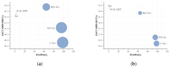 FLOPs and Jaccard accuracy: (a) is the Jaccard accuracy and FLOPs of OD; (b) is the Jaccard accuracy and FLOPs of OC.