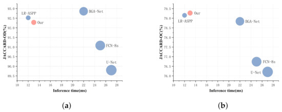 First, the relationship between the size of the network model and the Jaccard accuracy is analyzed, as shown in Figure 9. Our method achieves competitive results with the smallest network model size. The relationship between FLOPs and Jaccard accuracy is then analyzed, as shown in Figure 10. Our method achieves competitive results with minimal FLOPs. Figure 11 analyzes the relationship between inference time and Jaccard accuracy. The inference time of our method is second only to LR-ASPP [28], which is only about half of the other methods while achieving competitive segmentation results.