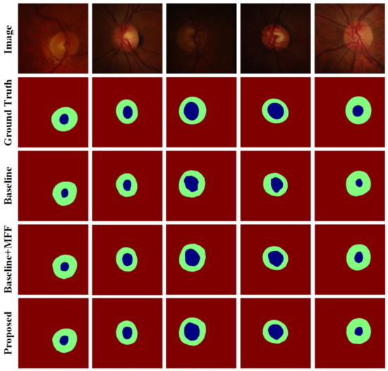 To verify the effectiveness of the multiscale feature fusion (MFF) module and the boundary feature auxiliary (BFA) module, we used the model with the MFF and BFA modules removed as the baseline to perform ablation experiments on the RIM-ONE-r3 dataset and gave quantitative results and qualitative results in Table 5 and Figure 12. The results demonstrate the effectiveness of the MFF and BFA modules.