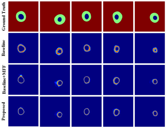 The results of ablation experiments show that the MFF module and BFA module can significantly improve the segmentation effect of the optic cup. Figure 13 shows the entropy map of the OC in baseline, baseline+MFF, and baseline+MFF+BFA (GlauNet). Figure 13 shows that the MFF module can effectively reduce the entropy of the cup boundary prediction map, but there is still some boundary noise. Based on the MFF module, the BFA module further suppresses the boundary noise and highlights the edge structure information of the optic cup. The entropy graph in Figure 13 demonstrates the effectiveness of the MFF module and the BFA module from another perspective.