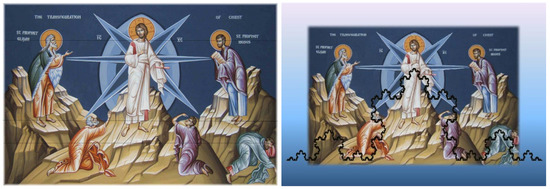 An important repercussion of von Neumann’s solution to the measurement problem is that the irreversibility takes place in the presence of the observer’s mind, which seems to play an active role in the process. The only manner to make such an unpleasant situation compatible with psychophysical parallelism concerns switching into the inner psychophysics, due to a change in representation which is the operator function of time [60]. In that regard, the inner psychophysics is represented by a Markovian tree of hidden variables, which corresponds to the recognition of structural information. It concerns a temporally based hierarchy whose paradigm is a memory that has taken an artistic form [61]. The traditional iconography is an instance of the time continuum, whose intensionality reflects in hierarchical structures of geometry (Figure 5). A temporal organization also characterized primordial painting, whose origins were traced up to the Stone Age [33], pp. 336–337, as well as the postmodern art during the XX century [62].