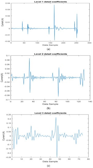 where, and in Equation (1), are transformed to be the functions of integers . The DWT technique can be used to effectively recognize non-stationary signals. The decomposition process is performed using the multiresolution analysis technique (MRA). The process is shown in Figure 1. The process begins with a signal passing through both the high and low pass filters. The low pass filter is replicated by the approximation coefficient and the high pass filter is replicated by the detail coefficient . At each level of decomposition, the detail coefficient information from the high pass filter is discarded before the process is re-established in the next level of decomposition. The most important aspect of using WT technique is the proper selection of a mother wavelet. The approximation and detail coefficients are mathematically represented as:
