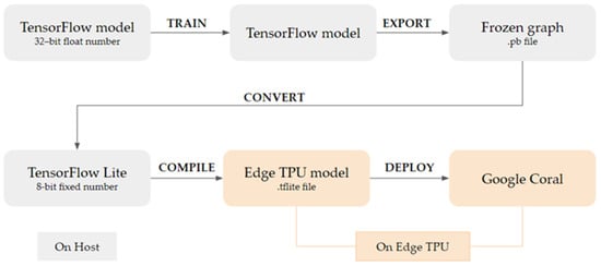30] to define and learn the structure of the CNN model. In order to apply a TensorFlow model to Coral edge devices, the trained model structure is required to be turned into a TensorFlow Lite (tflite) model through the quantization process, where the model parameters are represented as 8-bit integers. Next, the model is compiled by the Edge TPU compiler for execution on the Edge TPU runtime. Here, the compiler separates out the operations supported by the Edge TPU, whereas the other operations are separately executed on the CPU. After compiling for Edge TPU, the inference result is then obtained via a runtime within the Coral device. As in the NVidia Jetson setup, we use publicly available inference models for Coral Mini [