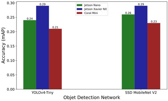 Figure 4 shows the measurement results of the detection accuracy in mAP between Jetson Nano, Jetson Xavier NX, and Coral Mini with YOLOv4-Tiny and SSD MobileNet v2 on the MS COCO dataset. We observe that Jetson Xavier NX performs the best with the mAP value of 0.29 for both detection models. On the contrary, Coral Dev Board Mini performs the worst compared to other devices. This is in contrast to the observations in our previous work [