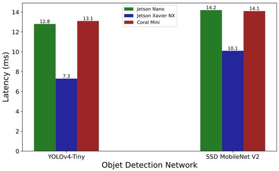 Figure 5 compares the inference latency of the used detection network models between the Jetson devices and Coral Mini. Jetson Xavier NX shows the best performance here for both the network models. For instance, with regard to the YOLOv4-Tiny model, Jetson Xavier NX performs 75% faster than Jetson Nano, and 79% faster than Coral Mini. Since Jetson Xavier NX is equipped with the most powerful hardware resources including the host CPU (6 cores), the GPU accelerator (384 CUDA cores), and the memory (8 GB), the observed best-performing behavior among the examined devices can be considered very natural.