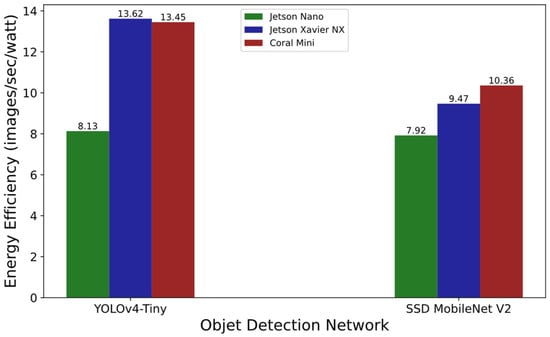Figure 6 compares the examined devices according to the energy efficiency perspective in executing each object detection network model. The results show that Jetson Nano performs the worst in processing images per unit energy for both YOLOv4-Tiny and SSD MobileNet V2.
