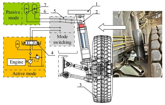 Emergency rescue vehicles are mainly used for rescues on land, which has a large load capacity and complex road conditions [1,2,3,4]. The suspension system can cushion the impact transmitted from the road to the vehicle body and ensure the driving smoothness and handling stability of the vehicle [5,6,7]. The commonly used suspension types include passive suspension, semiactive suspension and active suspension [8,9]. Compared with passive suspension and semiactive suspension, active suspension can actively adjust the suspension stiffness and damping parameters in accordance with the driving road conditions to improve the driving smoothness and stability of the vehicle [10,11,12]. In the case of ensuring the vibration suppression effect when driving on different roads, a single suspension mode cannot maintain low power consumption. Therefore, the suspension adopts an active mode under off-road conditions and a passive mode under good road conditions. This can effectively improve the environmental adaptability of the emergency rescue vehicle, reduce the power consumption and improve the operational life. A schematic of active and passive mode switching is shown in Figure 1. When the suspension is in the passive mode, the rod and rodless cavities of the actuator are connected with the accumulators to form a hydro-pneumatic spring. When the suspension is in the active mode, the rod and rodless cavities of the actuator are connected with a servo valve, and the servo valve controls the actuator to realize various control algorithms. The accumulator in front of the servo valve is used to stabilize the pressure pulsation, and the pump is driven by the engine. Furthermore, an overflow valve is set at the pump port to regulate the system pressure.