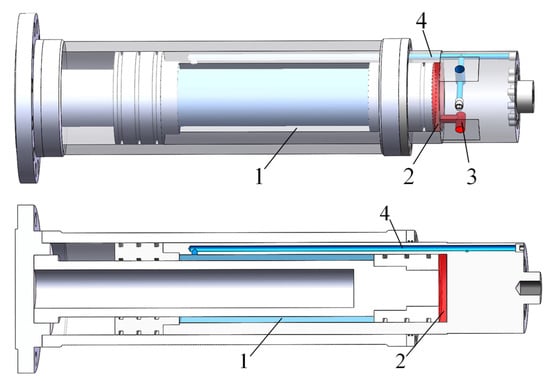 Actuator structure model. 1. Rod cavity. 2. Rodless cavity. 3. Rodless cavity channel. 4. Rod cavity channel.