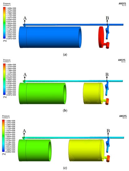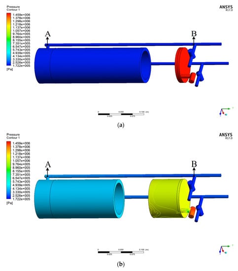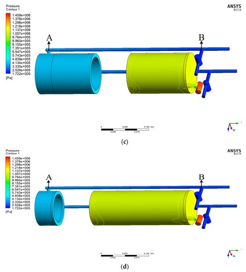 Figure 14 demonstrates that during the extension movement of the actuator—that is, when t = 0.2 s, t = 0.4 s and t = 0.67 s—the pressure drop from point A to point B in the rod cavity channel is small. As seen in Figure 10, when t = 0.67 s, the pressure at point A is 0.387 MPa, and the pressure at point B is 0.248 MPa, so the pressure drop is 0.139 MPa. Compared with PSA, the APCSA effectively reduces the pressure loss in the rod cavity channel.