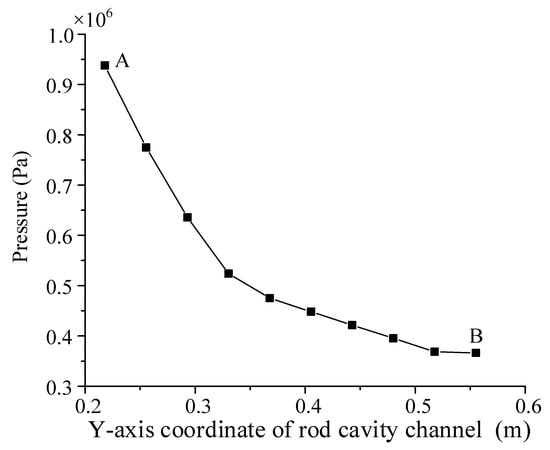 Figure 5 illustrates that during the extension movement of the actuator, a large pressure drop occurs from point A to point B in the rod cavity channel. When t = 0.67 s, the pressure from point A to point B at 10 positions is taken. The pressure curve is shown in Figure 6. The pressure of point A is 0.938 MPa and that of point B is 0.366 MPa, and the pressure loss is 0.572 MPa. Because the small diameter of the rod cavity channel causes a large pressure loss, the rod cavity channel needs to be redesigned.